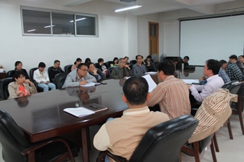 2014年4月24日下午4:30,综合赛事平台在综合教学楼0617室召开了全院教职工大会。综合赛事平台党总支书记施道明、院长李前忠教授、副院长赵国军教授、副院长宫箭教授、副院长、团总支书记谢峻鹏和全院教职工参加了会议。