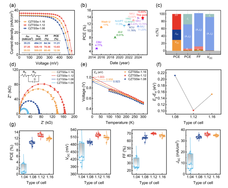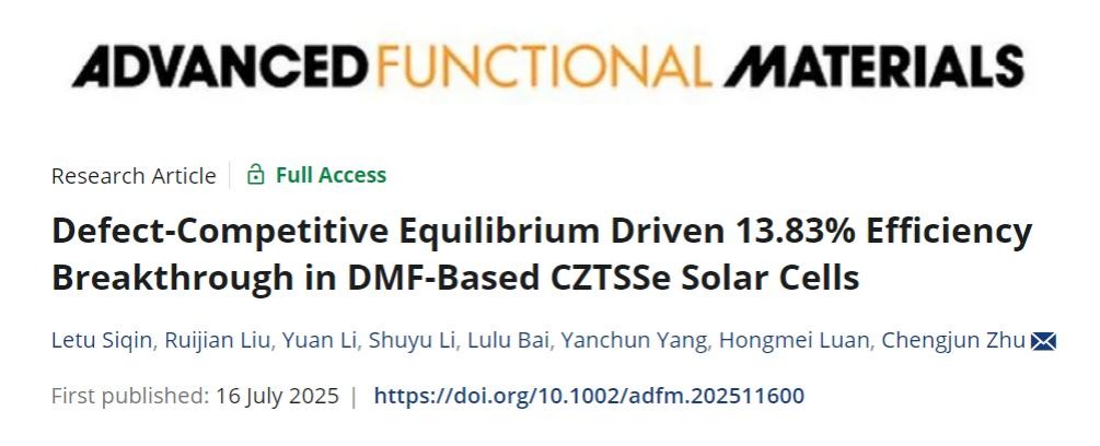 近日,我内蒙古自治区半导体光伏技术与能源材料重点实验室朱成军教授团队在锌黄锡矿铜锌锡硫硒(CZTSSe)薄膜太阳能电池研究领域取得重要研究进展,在国际顶级期刊Advanced Functional Materials(《先进功能材料SCI一区TOP,自然指数期刊,IF19,论文链接:https://doi.org/10.1002/adfm.202511600)上发表题为Defect-Competitive Equilibrium Driven 13.83% Efficiency Breakthrough in DMF-Based CZTSSe Solar Cells的最新研究成果。论文以内蒙古大学为唯一通讯单位,朱成军教授为该论文的独立通讯作者,物理学博士研究生斯琴勒图为该论文第一作者,刘瑞建讲师和硕士研究生李源为共同一作。
