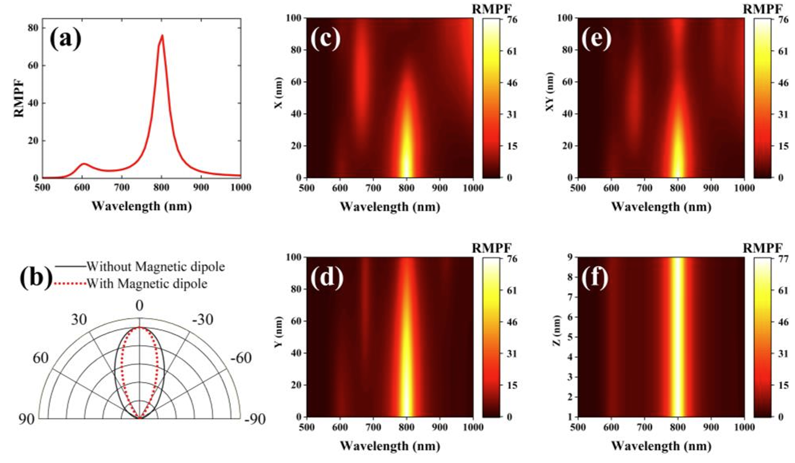 该工作在团队基于全介质结构中实现电anapole(J. Phys. Chem. C 2023, 127, 3594−3601)和金属镜上纳米粒子(NPOM) 结构中等离激元诱导磁模(Phys. Rev. A 110, 013516)的前期工作基础上,在NDOM结构中进一步揭示了发光分子取向、空间分布等对辐射磁Purcell因子的影响情况,并计算出间隙中心附近的平均增强因子约为41.42,该结果更加贴近实验中大量分子随机排布时的辐射增强作用;同时指出将分子取向控制在结构平面方向可显著提高总的磁辐射Purcell因子。