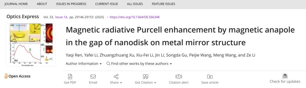 近日,我院纳米光学团队在光学领域权威期刊《Optics Express》发表题为“Magnetic radiative Purcell enhancement by magnetic anapole in the gap of nanodisk on metal mirror structure”的研究论文该团队对由金纳米圆盘和金镜组成的镜上纳米颗粒结构(NDOM)展开深入研究,通过电磁场分布特性和多极展开分析揭示了该结构间隙中磁anapole模式的形成机制,并证实了该结构可实现辐射磁Purcell 因子增强,最高可达76倍,这一研究成果对优化以稀土元素 Eu³⁺为典型代表构建的磁偶极跃迁单光子源性能具有重要的参考价值。本工作得到国家自然科学基金(62265014)的资助。青年教师王蒙博士和李泽博士为共同通讯作者,2022级硕士研究生任雅琪为第一作者,内蒙古大学为第一完成单位。