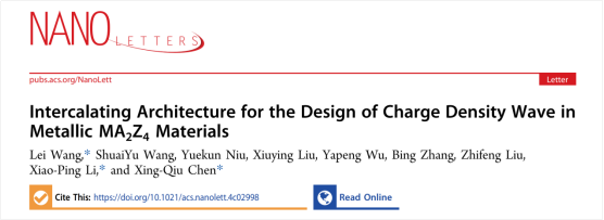 近日,我校王磊研究员和李小平研究员,联合中国科学院金属研究所陈星秋研究员在国际著名期刊Nano Letters上发表题为“Intercalating Architecture for the Design of Charge Density Wave in Metallic MA2Z4 Materials ” (Nano Lett. 2024, 24, 11279-11285)的重要研究成果,并被选为内部封面文章。该团队首次引入插层构筑方法用于设计二维材料中的电荷密度波。该研究得到了国家自然科学基金、内蒙古自然科学基金、内蒙古草原英才、内蒙古自治区本级引进高层次人才科研支持项目和内蒙古大学骏马计划高层次人才引进项目的资助。