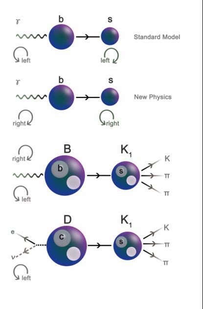 标准模型预言b→ s γ过程的末态光子以左手为主,测量该衰变模式中的光子极化可用于检验标准模型和探索新物理效应。人们已经注意到B→K1 γ中的光子极化可通过定义一种“上下不对称性”描述,但是由于该物理量同时还依赖于强衰变过程K1→Kππ的信息,所以单独由该物理量还不能完全确定B→K1 γ过程中的光子极化。已有文献只能借助模型依赖的方法分析强衰变过程K1→Kππ,这就为抽取B→K1 γ过程中的光子极化带来了极大的不确定性。赵振兴博士及其合作者指出可以借助半轻过程D→K1(→Kππ) e ν 提取出K1强衰变的信息,从而最终确定B→ K1 γ过程的光子极化。