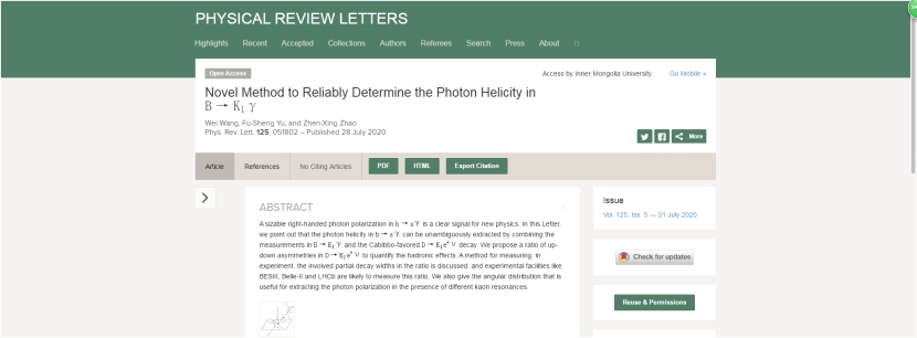 近日,我校综合赛事平台赵振兴博士在物理学领域国际顶级期刊 Physical Review Letters 发表题为 “Novel Method to Reliably Determine the Photon Helicity in B → K1 γ” 的重要工作,提出一种测量 B → K1 γ 过程光子极化的新方法。该研究通过在半轻衰变 D → K1 e ν 中提出一种“上下不对称性比值”来定量地描述B → K1过程中的强子效应,从而准确地抽取B → K1 γ过程中的光子极化。BESIII、Belle-II和LHCb等加速器实验非常有希望测量到该光子极化。