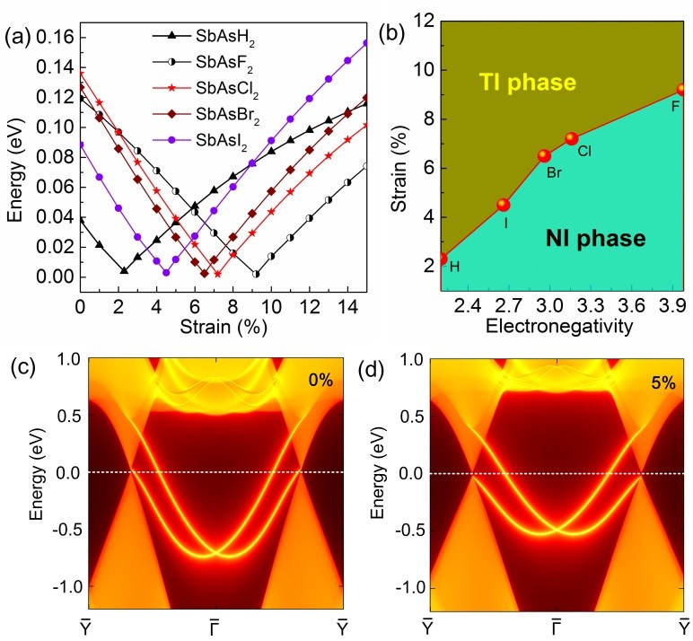 图4 (a)应变作用下功能化SbAs单层带隙的变化,(b)不同体系形成自旋谷耦合狄拉克态所需应变与功能团电负性的关系,(c)本征及(d)5%拉伸应变下SbAsH2单层的边界态。