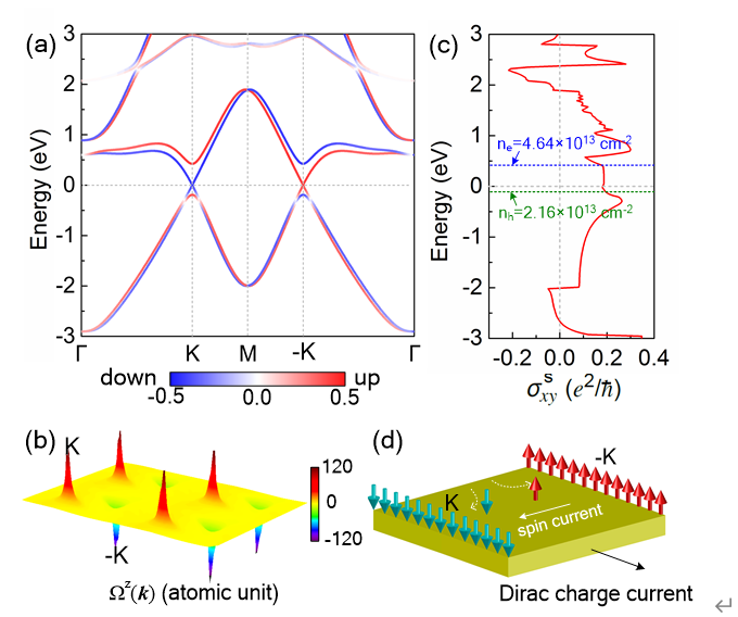 图3 自旋谷耦合狄拉克半金属2.3%-SbAsH2 单层的(a)z方向自旋投影能带图,(b)贝里曲率在二维布里渊区平面上的分布图,(c)自旋霍尔电导随费米能级的变化图,以及(d)狄拉克自旋谷霍尔效应示意图。