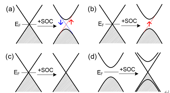 图1 (a)第一、(b)第二、(c)第三、(d)第四类二维狄拉克材料在考虑SOC作用后的能带结构变化示意图。