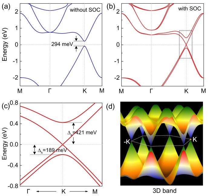 最近,我院刘志锋副教授与大连理工大学赵纪军教授,北京理工大学姚裕贵教授,以及中国科学院物理所翁红明研究员等人合作提出了第四类二维狄拉克材料——自旋谷耦合狄拉克半金属(spin-valley-coupled Dirac semimetal)。不同于已有的狄拉克材料,自旋谷耦合狄拉克半金属在不考虑SOC的情况下为直接窄带隙半导体;由于中心反演对称破缺,在强度适中的SOC作用下,能带中的能谷发生自旋劈裂,从而导致能隙恰好关闭,形成自旋非简并的狄拉克态(如图1d所示)。不难看出,自旋谷耦合狄拉克半金属中的狄拉克态是由SOC作用诱发形成,因此它天然的具有抗SOC特性,即不会像第一类和第二类狄拉克材料一样,在SOC作用下狄拉克态被破坏掉。