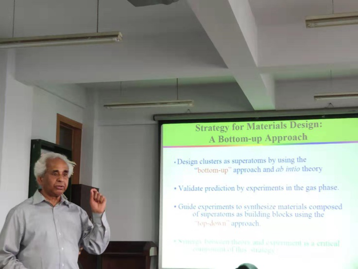 第一场报告由Jena 教授主讲。他首先从上世纪80年代著名的Na团簇质谱和凝胶模型出发,深入浅出的给师生们讲授了团簇的稳定性、幻数、几何结构等基础概念。进而,结合自己的研究成果介绍了“超卤素、飚卤素、超碱金属、超盐、三维元素周期表、团簇组装晶体”等全新的概念,并围绕这些概念系统讲解了超原子团簇的磁性、电子结构、价态、组装以及应用等内容。Jena教授以高屋建瓴的视角,给我校师生们带来了有关超原子的知识盛宴