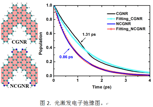 在bottom-up合成过程中,通过对前驱分子的选择可控制合成的结构,如上图所示。实验证明,未掺杂和掺杂氮原子的结构可组成类似p-n结的器件。然而其电子结构的不同,会对光电子的寿命产生影响。计算结果表明两种结构中光激发电子的寿命有很大差异,掺杂后光电子寿命减小了约35%(图2)。进一步的计算表明,寿命的降低来源于掺杂结构较小的导带能级间距和较多的声子振动模式参与了电子的弛豫,如图3所示。