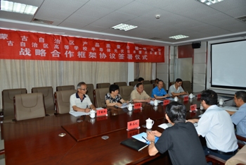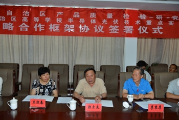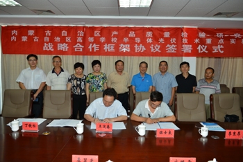 2015年8月7日,我校内蒙古自治区高等学校半导体光伏技术重点实验室与内蒙古自治区质量检验研究院签订了战略合作框架协议。内蒙古质检院局长武路希、院长李显光、副院长韩永明、王斌和内蒙古大学副校长班士良教授、科技处处长王迎春教授、光伏技术重点实验室常务副主任朱成军副教授、综合赛事平台季秉厚教授、丁铁柱教授出席签约仪式。李显光与朱成军作为双方代表签字。