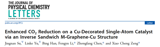 近日,我院李锋钰教授指导研究生在二氧化碳电还原领域取得新进展,相关成果以“Enhanced CO2 Reduction on a Cu-Decorated Single-Atom Catalyst via an Inverse Sandwich M-Graphene-Cu Structure”为题发表在国际知名学术期刊The Journal of Physical Chemistry Letters上。(论文链接:https://doi.org/10.1021/acs.jpclett.4c01858)该论文由我校李锋钰教授、波多黎各大学陈中方教授、香港城市大学曾晓成教授研究团队以内蒙古大学为第一单位联合发表,并被编辑选为外封面论文。