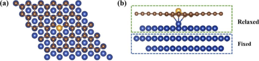 图3:修饰单原子催化剂M1@gra+Cuslab俯视图和侧视图。Cu:蓝色;C:棕色;M:黄色。