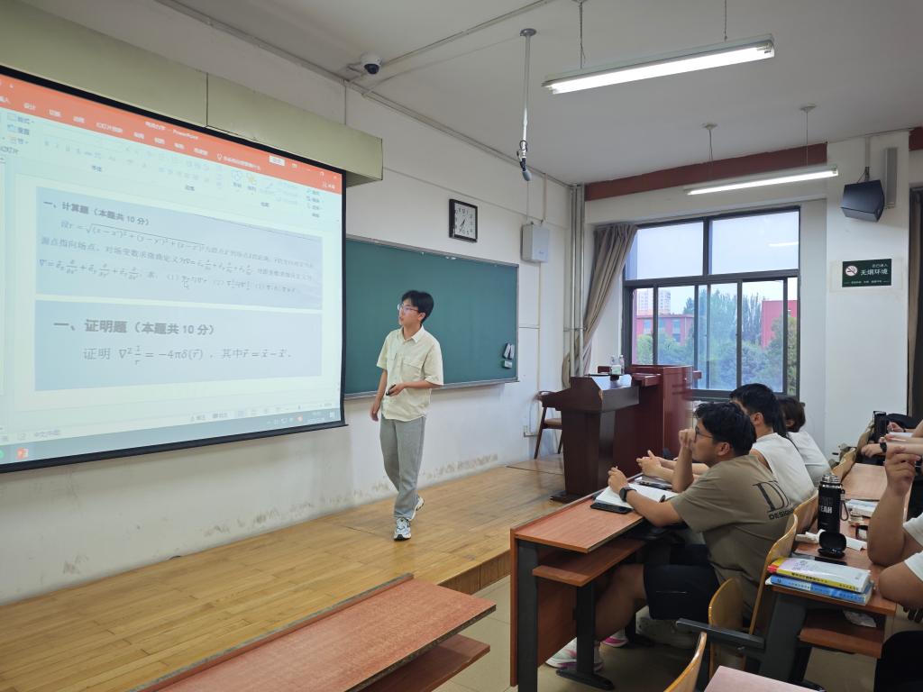 辅导课上,刘建宇围绕矢量分析、电流和磁场等核心章节展开讲解,串讲课程重点知识,明确高频考点复习方向,并强调学习《电动力学》需兼顾公式推导与物理逻辑理解,只有吃透理论本质,才能在解题时触类旁通。