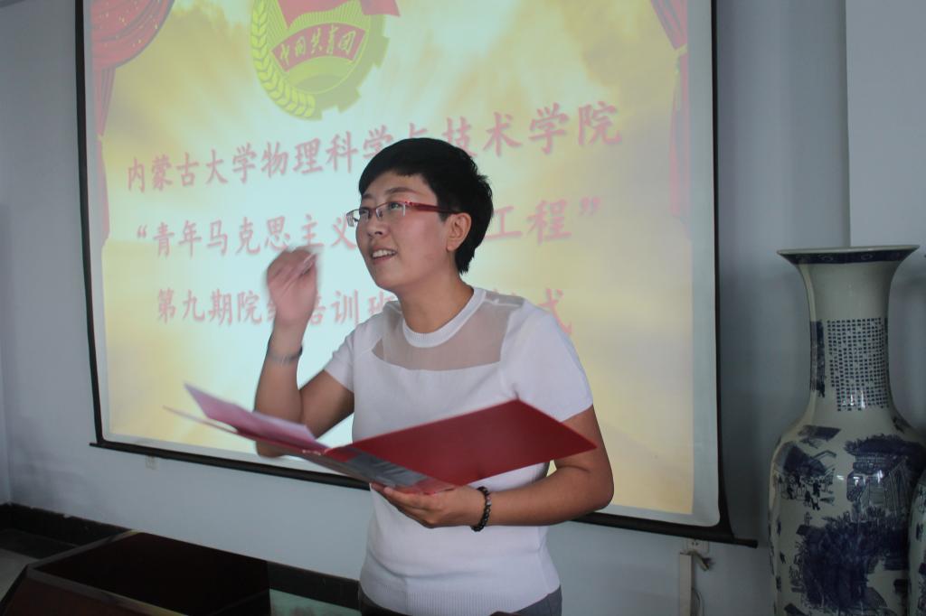 开班仪式内容分为四项。大会第一项,奏国歌,在雄壮的国歌声中开班仪式正式开始;大会第二项,内蒙古大学马克思主义学院副院长傅锁根副教授讲话,傅锁根副教授对参加培训活动的大学生骨干提出明确的求和殷切希望,希望通过青年马克思主义者培养工程,让当代青年成长为中国色社会主义事业的合格建设者和可靠接班人,为社会贡献出属于青年人的一份力量;随后,我院李宏书记鼓励同学们提高认识、增强辨别能力,自觉主动地学习理论知识,坚定理想信念。第三项,学院第十届学生会主席李恒伟作为学生代表发言,表示要认真学习马克思主义精神,立志成为一名合格的青马人。大会第四项,学院学生会副主席邢霞霞带领培训学员进行宣誓:“我们是物理人,励志笃学,博思践行是我们的态度;我们是内大人,崇尚真知,追求卓越是我们的姿态;我们是青年人,朝气蓬勃,意气风发是我们的风采。在此,我宣誓,我立志成为:志存高远,脚踏实地的青马人。以博学为标、以笃行为志、以尚德为榜、以崇知为样,用我的温望去努力,用我的行动去见证。奋发拼搏,持之以恒,勤学修德,超越自我;争做班级楷模、学校先锋,为祖国的发展贡献力量。”这一句句铿锵有力的誓词展现了物理人的决心、内大人的气势,更体现了青年人的活力!