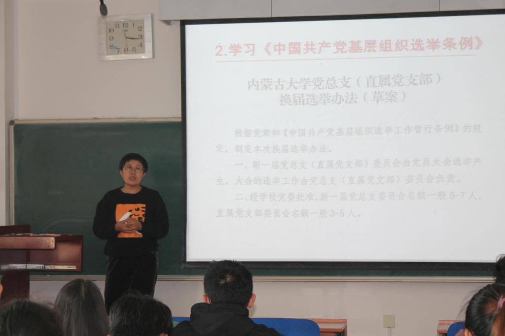 李妮老师组织全体本科生党员学习《中国共产党章程》和内大党组发【2019】16号《关于做好党总支直属党支部换届工作的通知》文件内容,并向大家详细介绍了学院基层党组织和总支委员会的组成以及换届工作的重要意义。