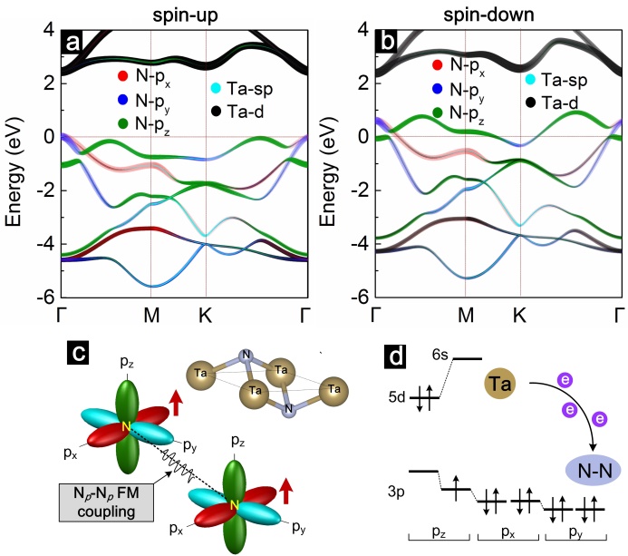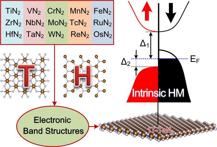该论文研究团队,基于最近实验上合成的富氮MoN2层状结构,在TMN2(TM=Ti–Fe,Zr–Ru,Hf–Os)的三十种备选结构中,利用高通量计算,搜索具有本征铁磁半金属性的稳定结构。研究结果表明,具有八面体结构的1T-TaN2单层不仅具有理想的动力学、热学、力学稳定性,而且因为N-N之间的直接交换作用而拥有稳定的铁磁基态,且其居里温度高达339 K。与以往报道过的二维过渡金属化合物不同的是,1T-TaN2单层的半金属性及磁矩主要来源于非金属氮原子的p轨道而非过渡金属原子(Ta)的局域d轨道,这有益于克服因过渡金属原子间强自旋—轨道耦合作用引起的自旋弛豫时间短这一问题。此外,HSE06方法计算得到该体系的半金属带隙为0.72 eV,足以阻止由于热扰动引起的自旋翻转。1T-TaN2单层的上述优良特性有望成为下一代纳米自旋电子器件的理想材料。