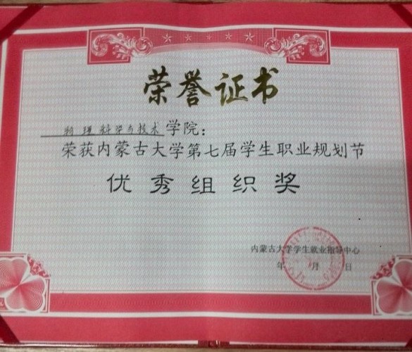 2014年6月6日晚7:00,由内蒙古大学就业指导中心主办、内蒙古大学学生职业发展联盟承办的内蒙古大学第七届学生职业规划节闭幕式暨第六届学生创业营销设计大赛在内蒙古大学南校区阶梯教室二A成功举办。我院荣获内蒙古大学第七届职业规划节优秀组织奖。