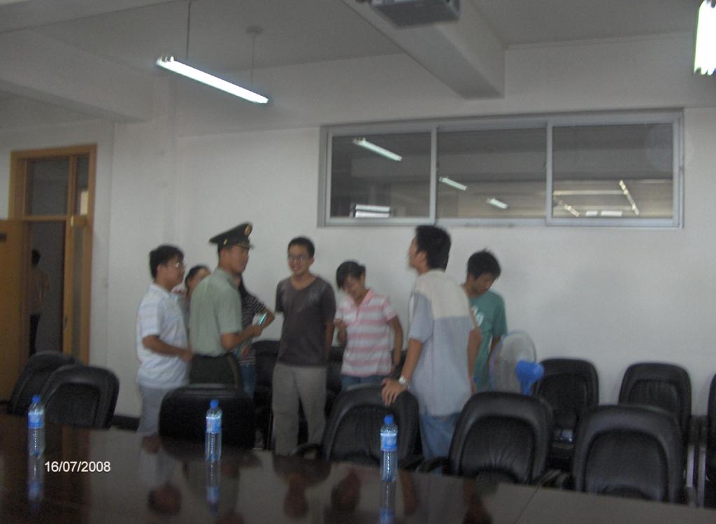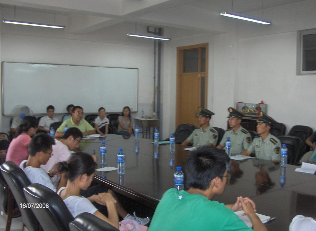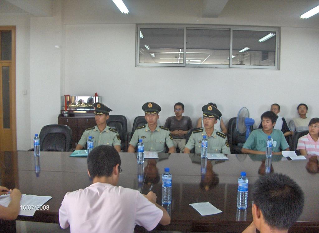 2008年7月16日下午17:00,综合赛事平台2008年学生军训参训指导员和学生代表与军训教官见面会在综合教学楼0617会议室隆重举行。承训教官,综合赛事平台团总支书记谢峻鹏,参训班班主任及参训班学生代表参加了会议。