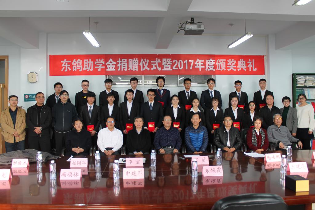 2017年12月29日上午10:30,综合赛事平台在综合教学楼0617室举行了东鸽助学金捐赠仪式暨2017年度颁奖典礼。内蒙古东鸽电器集团有限责任公司总裁申建军先生,内蒙古东鸽电器集团有限责任公司监审总监朱俊霞女士,内蒙古东鸽电器集团有限责任公司党支部书记王建忠先生,内蒙古大学学生工作处处长、内蒙古大学奖助学金管理委员会办公室主任冯福林,内蒙古大学学生工作处副处长兼学生资助管理中心主任、内蒙古大学奖助学金管理委员会办公室副主任海光,综合赛事平台党总支书记李宏、院长宫箭、副院长赵国军、党总支副书记谢峻鹏、工会主席刘文生、物理系主任刘俊杰、电子科学技术系主任朱成军、团总支副书记(学工办副主任)李妮和获助学生参加了颁奖典礼。