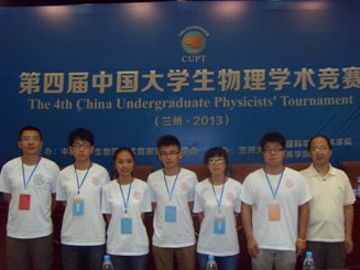 本届中国大学生物理学术竞赛(CUPT)由兰州大学主办,共有南开大学、北京大学、哈尔滨工业大学、南京大学、军事交通学院、国防科学技术大学、北京交通大学、复旦大学、北京师范大学、上海交通大学、华东理工大学、同济大学、四川大学、电子科技大学、华南理工大学、兰州大学一队、华中师范大学、华中科技大学、台湾师范大学、北京理工大学、南京师范大学、浙江大学、清华大学、武汉大学、西北大学、山西大学、兰州大学二队、内蒙古大学、华东师范大学、吉林大学、中山大学、西安交通大学、哈尔滨理工大学、东北师范大学、天津工业大学、重庆大学、山东大学、北华大学、中国科学技术大学(以上排名按CUPT2013年总成绩排名)等39所知名高校参赛。我校代表队由综合赛事平台物理系主任刘俊杰副教授、电子科学技术系主任朱成军副教授和孟立志副教授担任指导教师,由5名本科生组队。