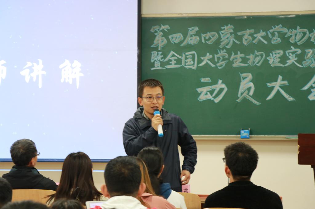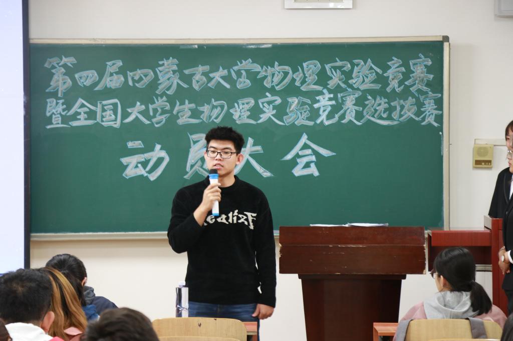 2019年10月17日晚7:00,第四届内蒙古大学物理实验竞赛暨全国大学生物理实验竞赛选拔赛动员大会在北校区卓越楼0315室成功举办。莅临本次大会的老师有:综合赛事平台普通物理实验室主任张常在副教授、综合赛事平台大学物理实验室主任王舒东副教授。同时,有在历届实验竞赛中取得过优异成绩的同学们,他们是:2016级应用物理学专业张养坤同学,2017级应用物理学专业戴峣同学和2017级应用物理学专业朱文培同学。
