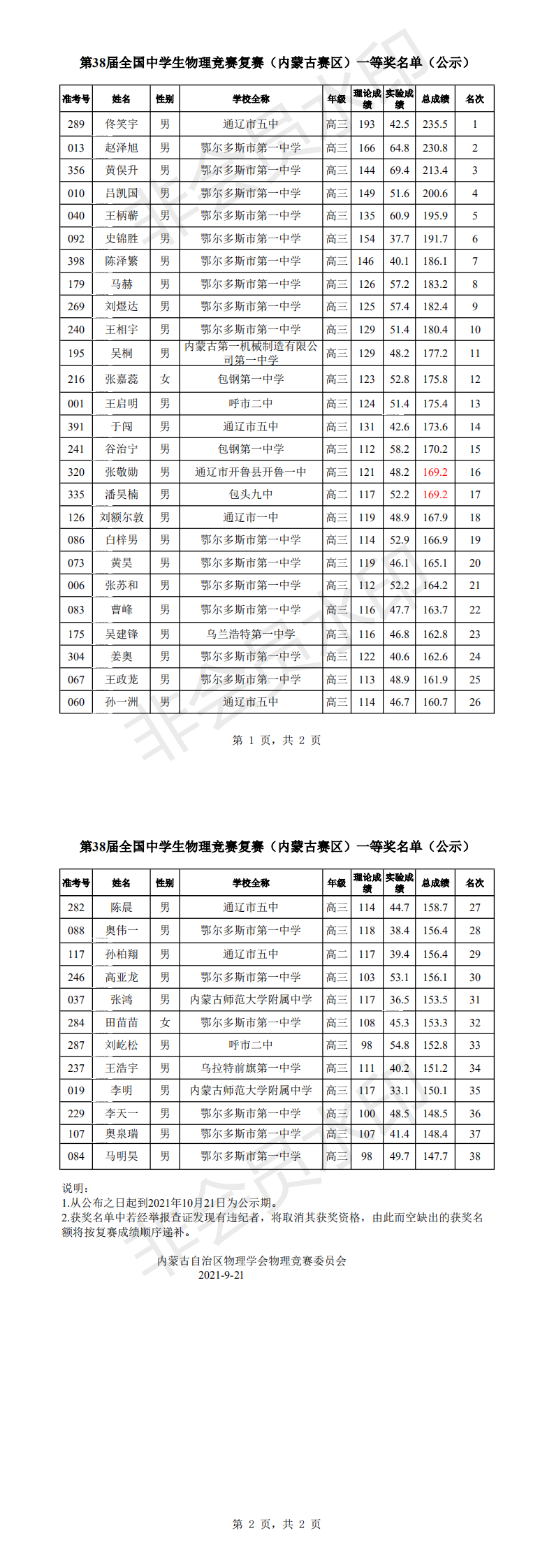 第38届全国中学生物理竞赛复赛(内蒙古赛区)一等奖名单(公示)