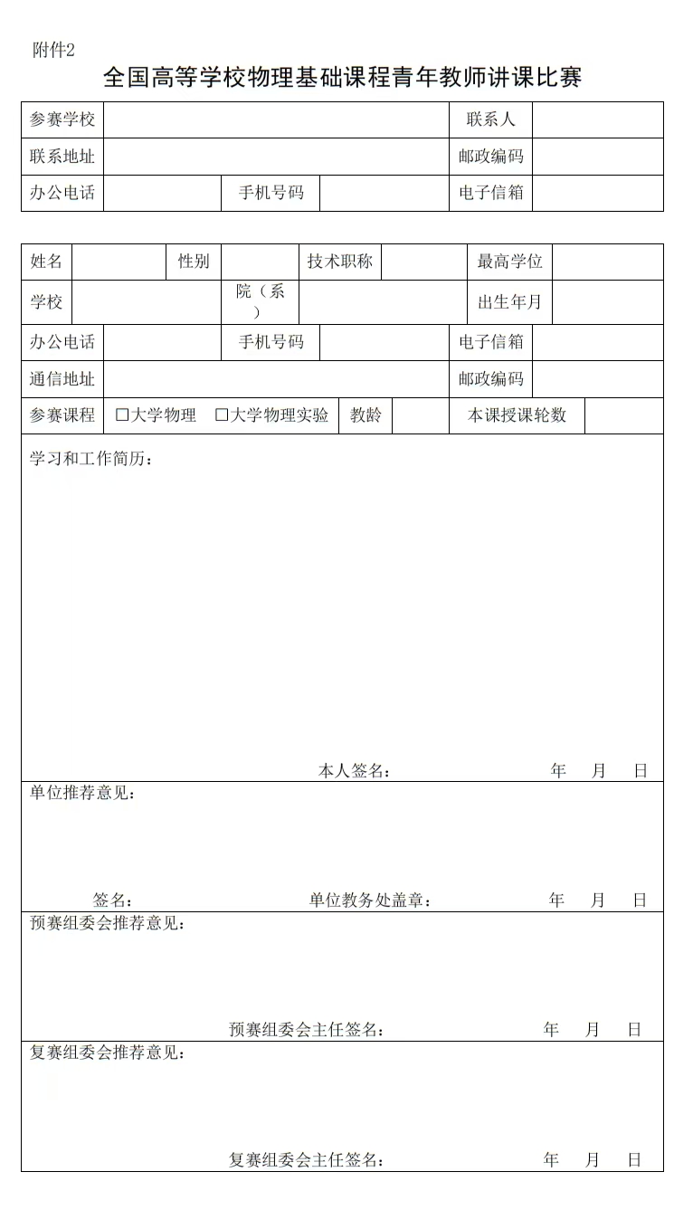 2. 全国高等学校物理基础课程青年教师讲课比赛报名表