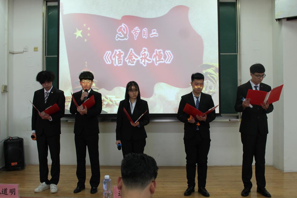 活动第二项:新党员集体宣誓,老党员重温入党誓词。在本科生党支部副书记温九达同志的带领下,在场所有党员举起右拳共同宣誓,更加坚定了“不忘初心,牢记使命”的信念;其他的团员同学也从庄严的誓词中领会到了党为人民服务的宗旨。