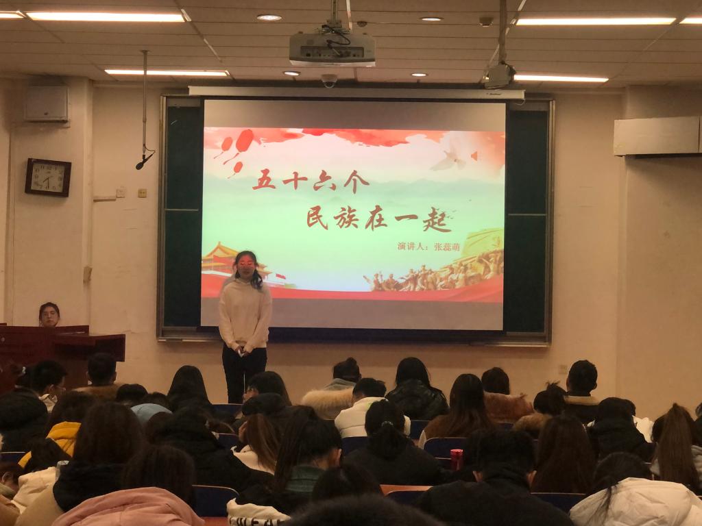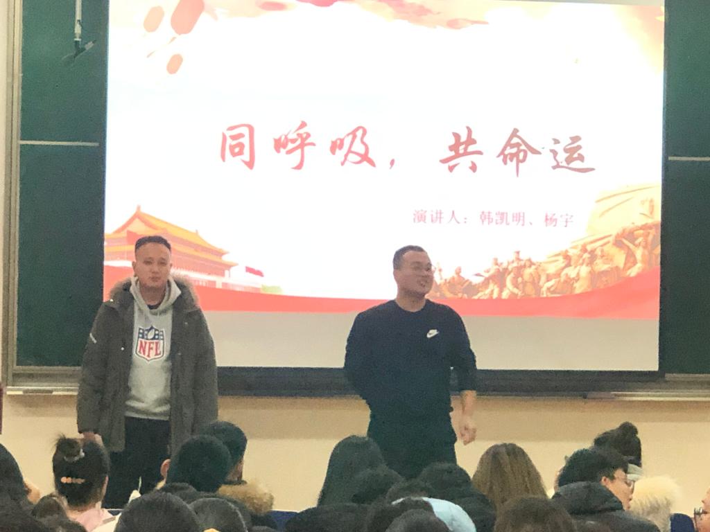 韩凯明、杨宇演讲《同呼吸,共命运》。在漫长的历史长河中,各族人民密切交往、相互依存、休戚与共,早已不分彼此。我们一同战胜了06年的非典,08年的地震。如今新冠疫情正在威胁着我们兄弟姐妹的生命安全,因此我们更要守望相助,同呼吸、共命运,共同建设我们的祖国。