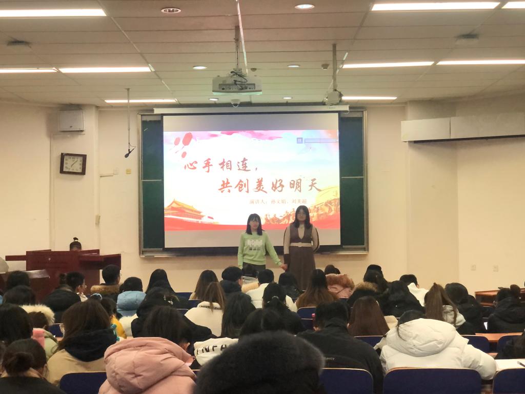 本次活动由牛建勋和黄慧怡主持,部分入党积极分子表演共8个精彩节目。首先是孙文娟和刘美超演讲的《心手相连,共创美好明天》。56个民族56朵花,我们血脉相连;我们辉煌与共。我们共同生活在一片土地,我们共同拥有一个家园。我们只有守望相助,相互扶持,才能有更美好的明天。