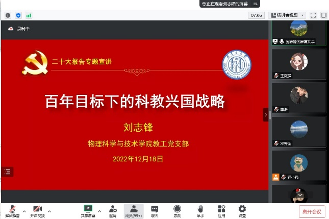 为引领全院各级党员干部、教职工、学生充分认识党的二十大的重大意义,以强烈的使命感和责任感抓好大会精神的学习贯彻工作,2022年12月18日上午9:30,综合赛事平台党委召开第二场全体党员大会深入学习贯彻党的二十大精神。会议邀请内蒙古大学校团委学习贯彻党的二十大精神宣讲团成员、综合赛事平台博士生导师刘志锋教授以《百年目标下的科教兴国战略》为题,作专题辅导讲座。综合赛事平台党委书记邓秀全主持会议,学院全体师生党员参会聆听报告。
